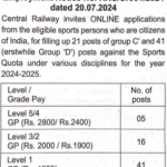 RRC CR Sports Quota Recruitment 2024 Online Apply for 62 Posts Level-1, Level-3/2, Level-5/4 @rrccr.com : Railway Recruitment Cell, East Central Railway (RRC ECR) Central Railway Sports Quota 20-26 July 2024 has published notification for 62 vacancies through employment newspaper. As per the notification the application process will continue from 22 July 2024 to 21 August 2024 … [Read more...] about RRC CR Sports Quota Recruitment 2024 Notification Out For 62 Posts