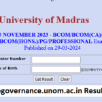 Latest Update on 28th April 2024 :Official results were published on March 29, 2024, for the November 2023 examinations for BCom, BCom (CA), BCom (BM), BCom (A&F), BCom (Hons.), PG, Professional (including MBA), MA (HRM), and MSC (CST). Madras University will host the results on three servers accessible via unom.ac.in.For Result ClickThe University of Madras … [Read more...] about egovernance.unom.ac.in Results 2024 (Out) Check Marksheet UG,PG